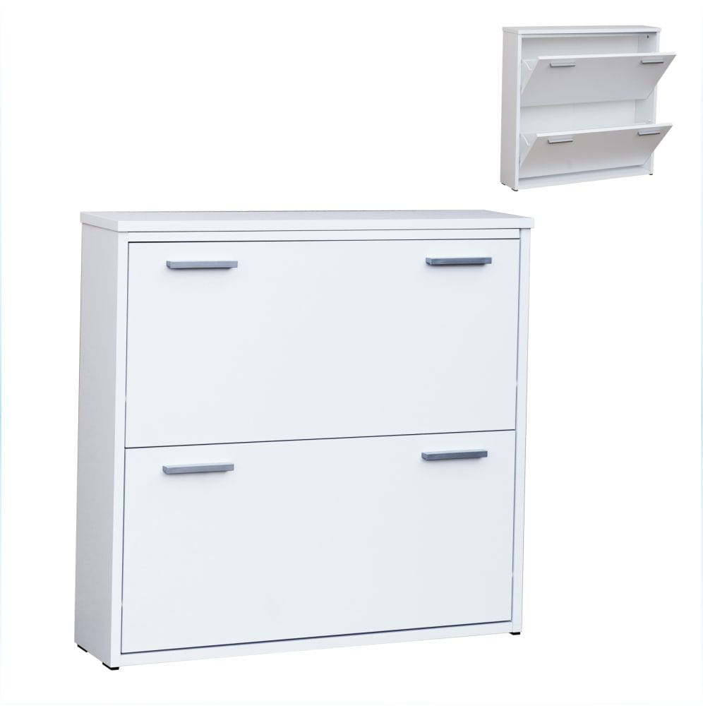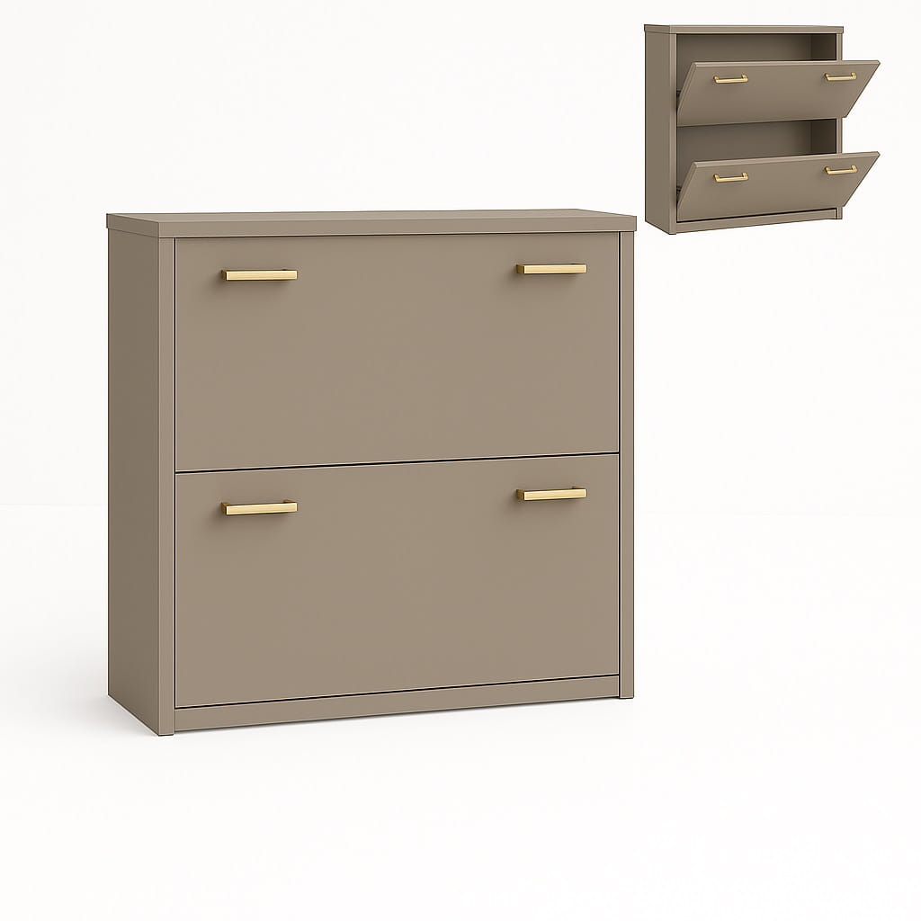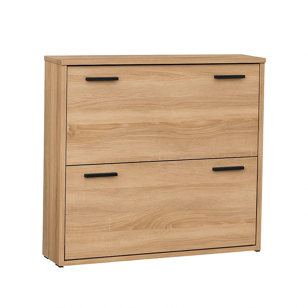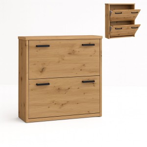 Szafka została wyposażona w dwie uchylne klapki z jedną przegrodą na buty, które ułatwiają szybki dostęp do przechowywanego obuwia. Dzięki temu szafka na buty z uchylnymi klapkami pozwala zachować porządek w przedpokoju i wygodnie organizować przestrzeń.