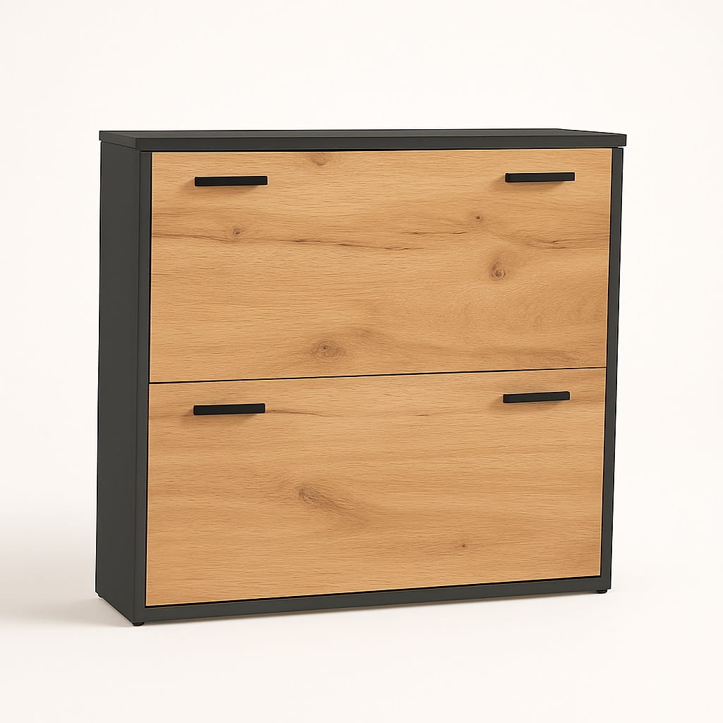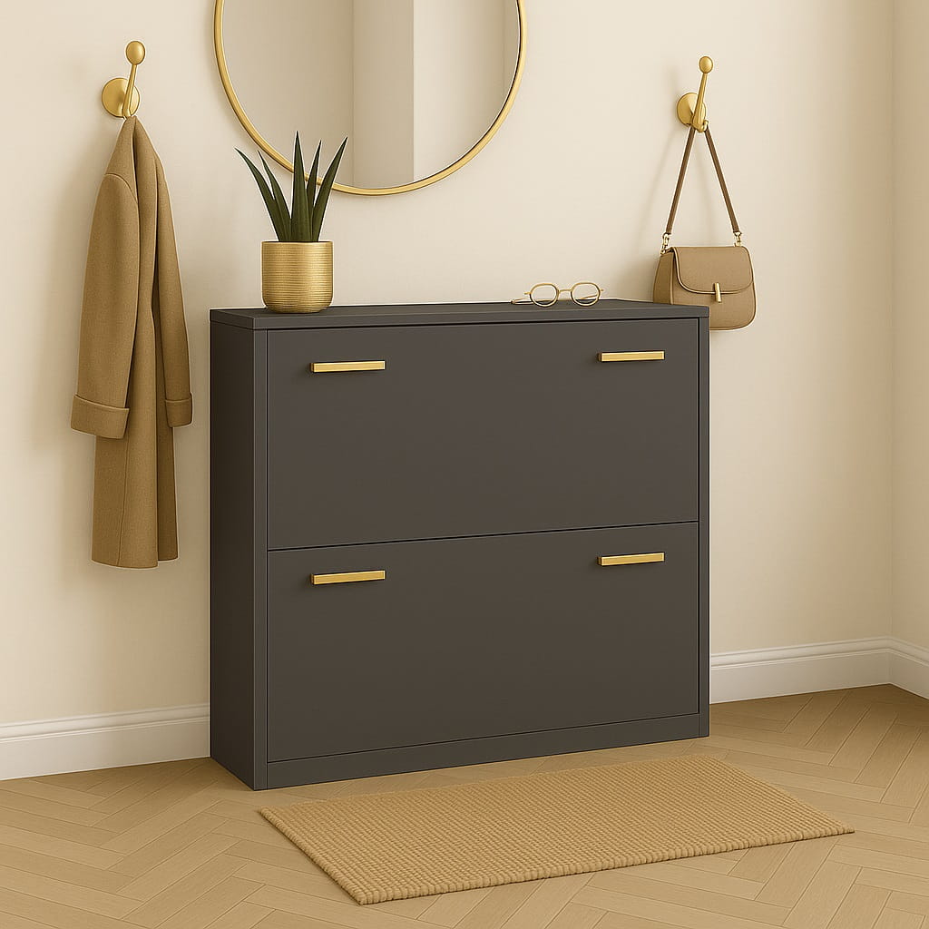 To funkcjonalna szafka na buty do przedpokoju, która pozwala utrzymać porządek, maksymalnie wykorzystać przestrzeń i jednocześnie podkreślić nowoczesny charakter wnętrza.