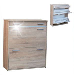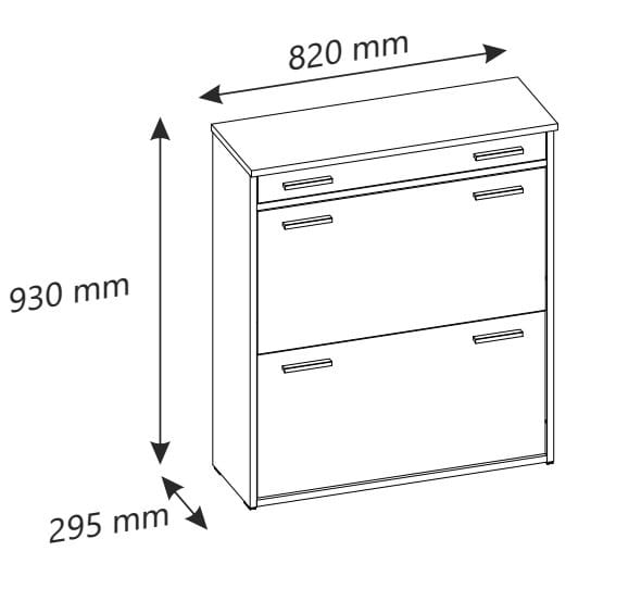 Szafka została wyposażona w dwie uchylne klapki z podwójną przegrodą na obuwie, co znacząco zwiększa jej pojemność. Dzięki temu szafka na buty z uchylnymi klapkami umożliwia przechowywanie wielu par butów przy zachowaniu kompaktowych wymiarów mebla.