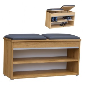 Pod wygodnym siedziskiem znajduje się praktyczny schowek otwierany na metalowych zawiasach, który pozwala przechowywać obuwie lub inne akcesoria. szafka na buty z pojemnikiem pod siedziskiem umożliwia maksymalne wykorzystanie przestrzeni w przedpokoju.