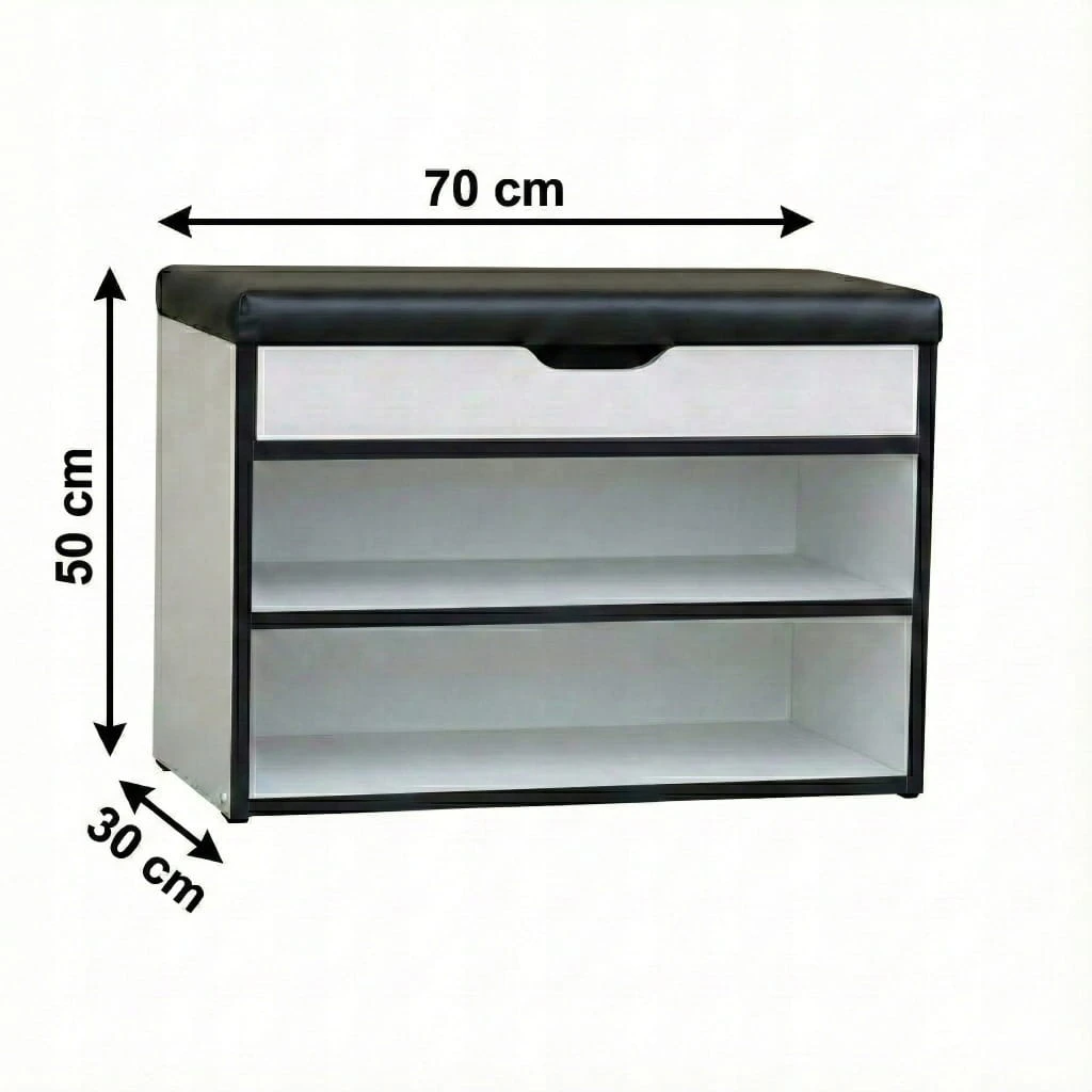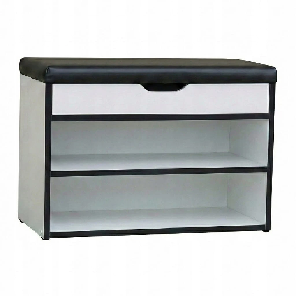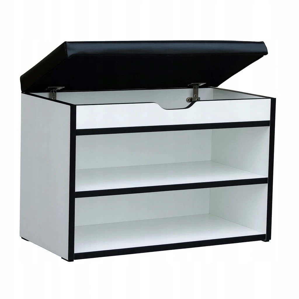 Klasyczna i funkcjonalna szafka na buty w kolorze Biały Alaska + PCV Czarny + Velvet Czarny, która łączy elegancję z praktycznością. Wyposażona w pojemny schowek otwierany na metalowych zawiasach oraz wygodne siedzisko, dzięki któremu zakładanie i zdejmowanie obuwia staje się wyjątkowo komfortowe.