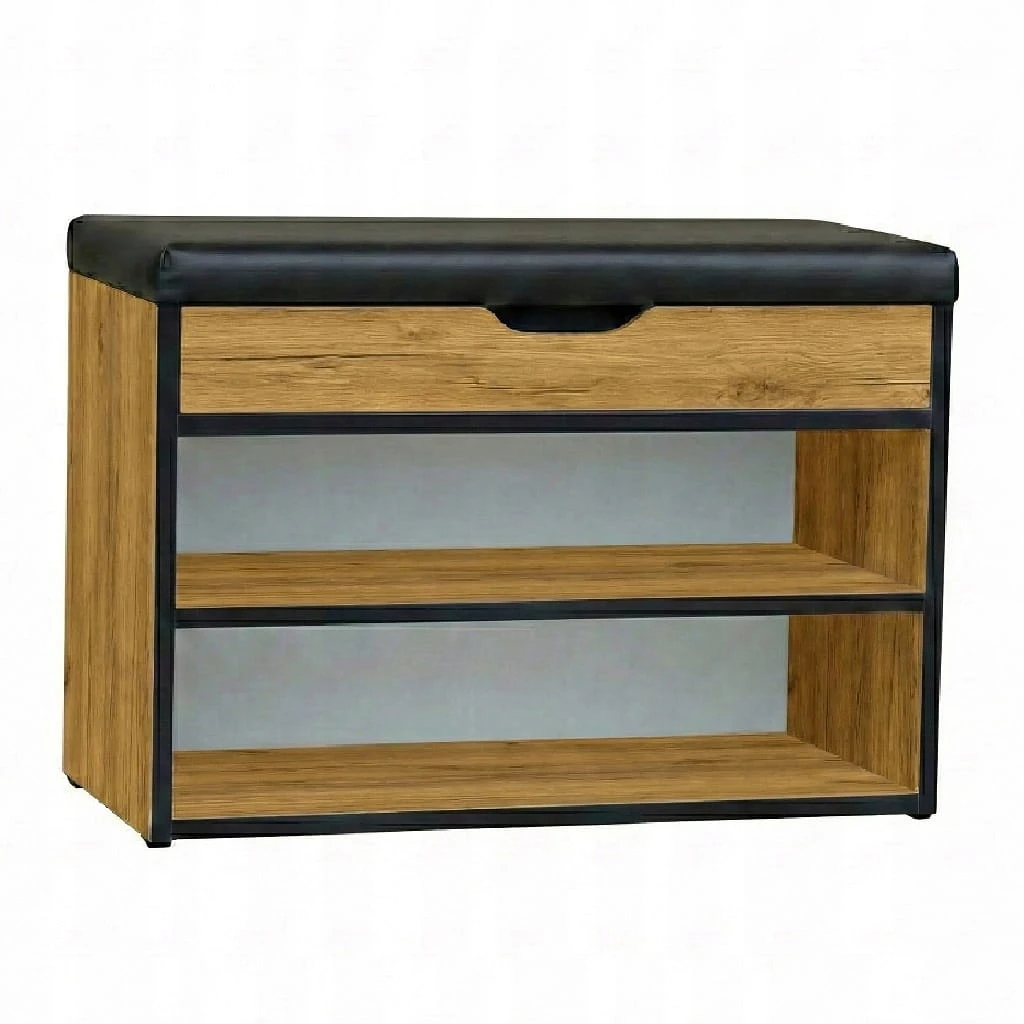 Klasyczna i funkcjonalna szafka na buty w kolorze Dąb Craft Złoty + PCV Czarny + Velvet Czarny, która łączy elegancję z praktycznością. Wyposażona w pojemny schowek otwierany na metalowych zawiasach oraz wygodne siedzisko, dzięki któremu zakładanie i zdejmowanie obuwia staje się wyjątkowo komfortowe.