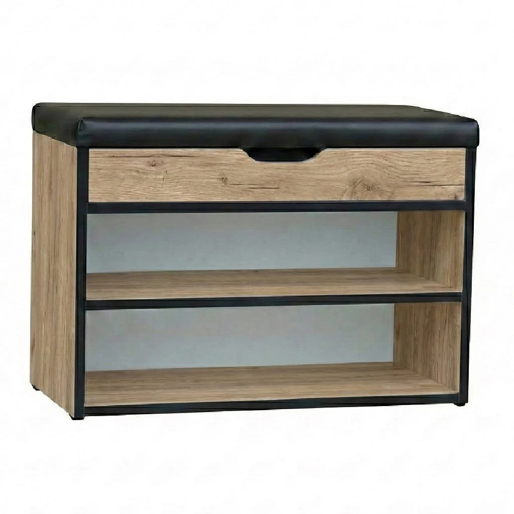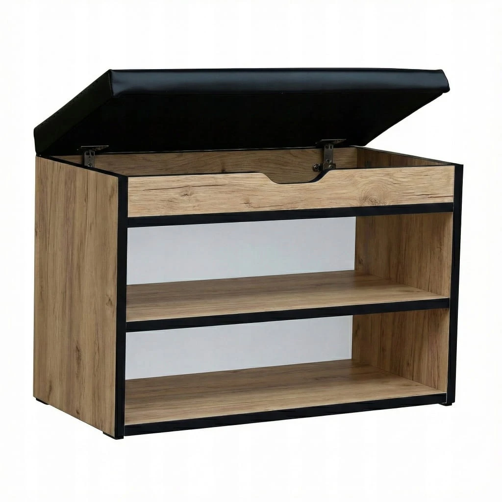 Klasyczna i funkcjonalna szafka na buty w kolorze Dąb Sonoma + PCV Czarny + Velvet Czarny, która łączy elegancję z praktycznością. Wyposażona w pojemny schowek otwierany na metalowych zawiasach oraz wygodne siedzisko, dzięki któremu zakładanie i zdejmowanie obuwia staje się wyjątkowo komfortowe.