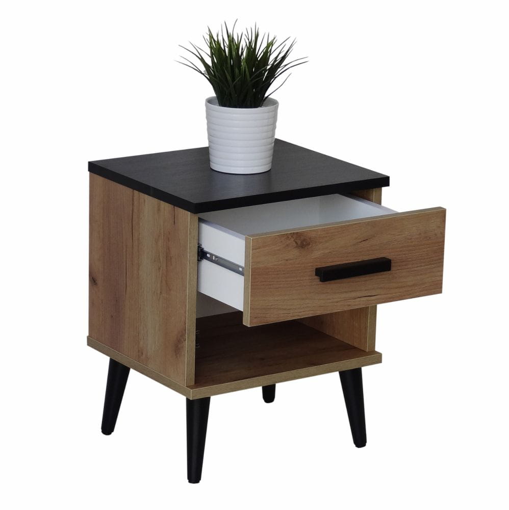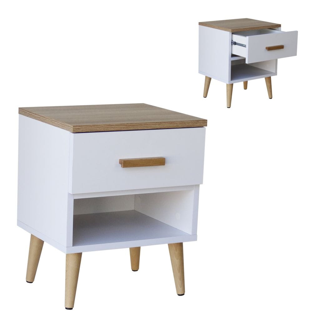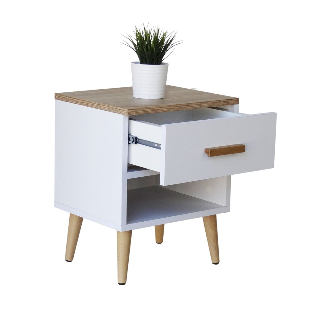 Szafka została zaprojektowana w popularnym stylu skandynawskim, który łączy prostotę formy z naturalnymi materiałami. Drewniane nogi oraz minimalistyczny korpus sprawiają, że szafka nocna skandynawska doskonale komponuje się zarówno z nowoczesnymi, jak i klasycznymi aranżacjami sypialni.