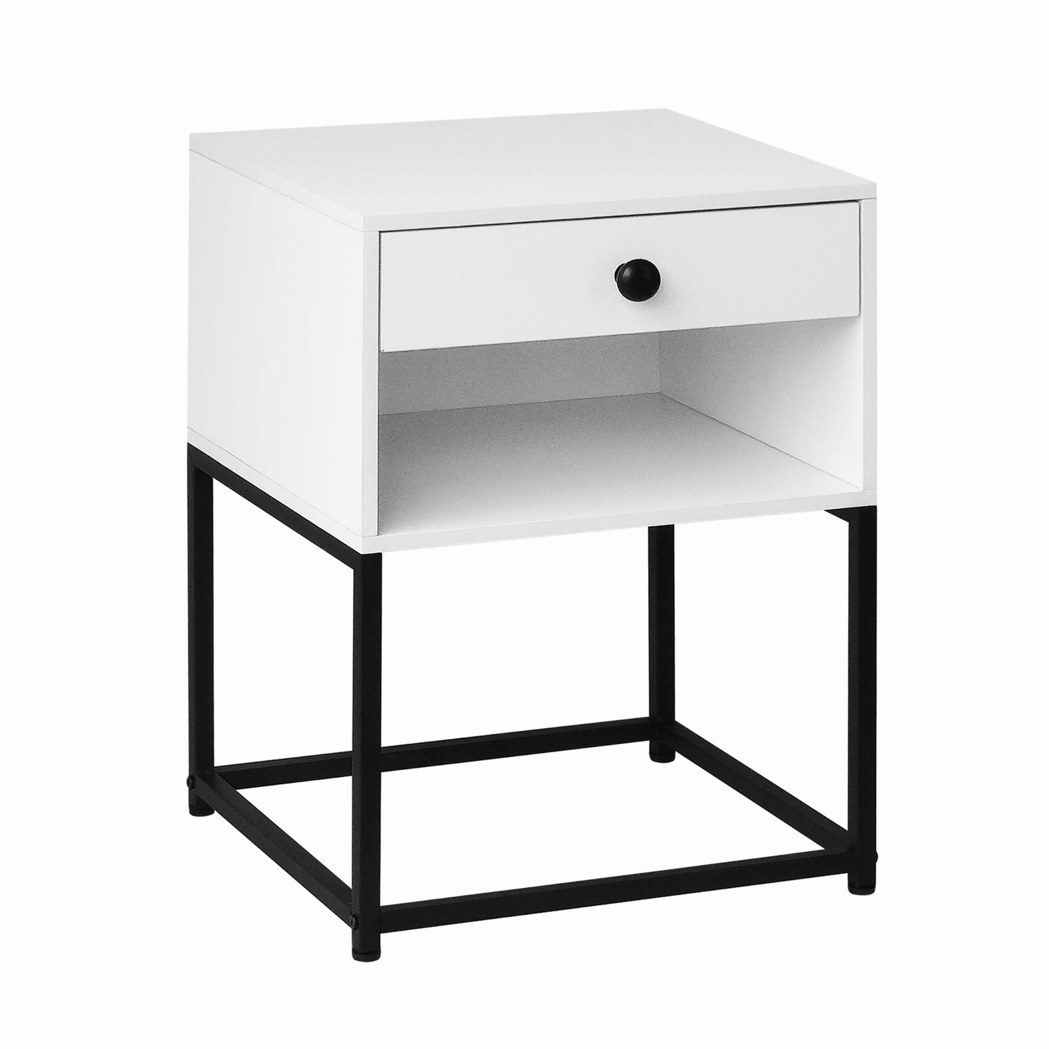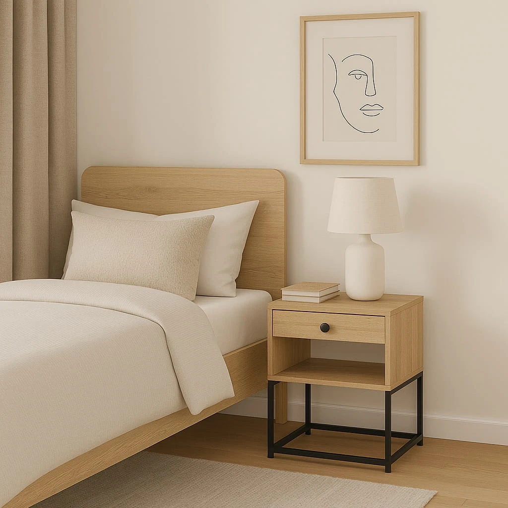 Połączenie płyty laminowanej z solidnym metalowym stelażem sprawia, że szafka nocna w stylu loft doskonale wpisuje się w nowoczesne, industrialne oraz minimalistyczne aranżacje wnętrz.