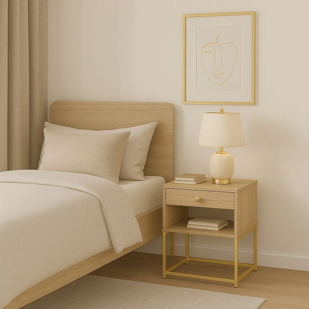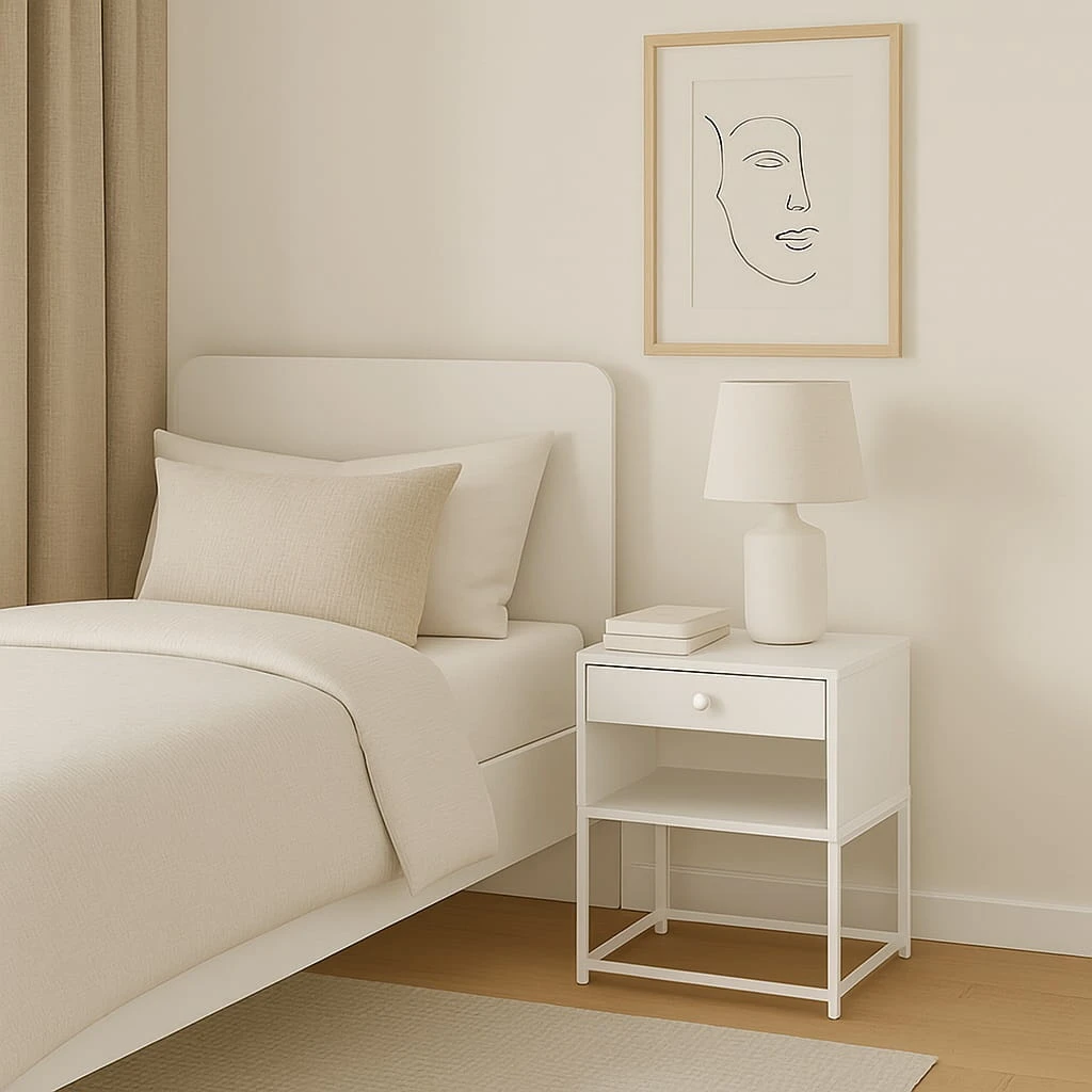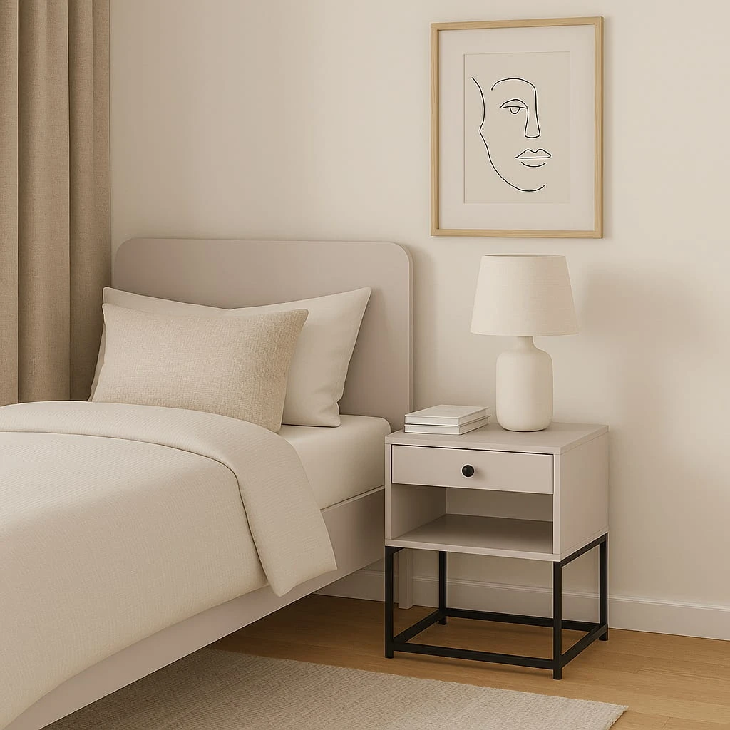 Szafka została wyposażona w pojemną szufladę, która pozwala przechowywać książki, ładowarki, okulary czy inne drobiazgi potrzebne w sypialni. Dzięki temu szafka nocna z szufladą pomaga utrzymać porządek przy łóżku.