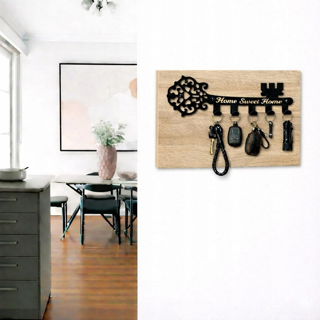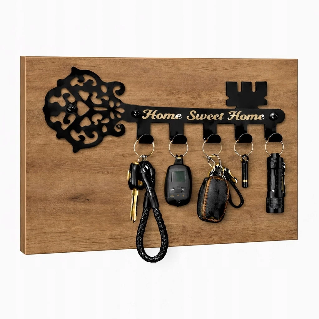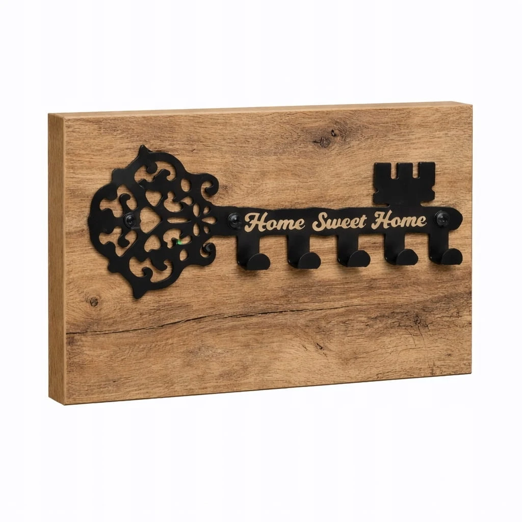 Wieszak na klucze na płycie w kolorze Dąb Craft Złoty. Wykonany jest z wysoko gatunkowej blachy 1,5mm. Płyta zapobiega wycieraniu ściany przez wiszące klucze. Wieszak został wycięty techniką laserową, a całość lakierowana jest dwustronnie wysokiej jakości farbami o drobnej strukturze. Zapewnia to ochronę przed zarysowaniami oraz gwarantuje brak śladów odcisków palców. Domyślny kolor produktu: CZARNY. W komplecie gratis kołki oraz zaślepki w kolorze wieszaka.