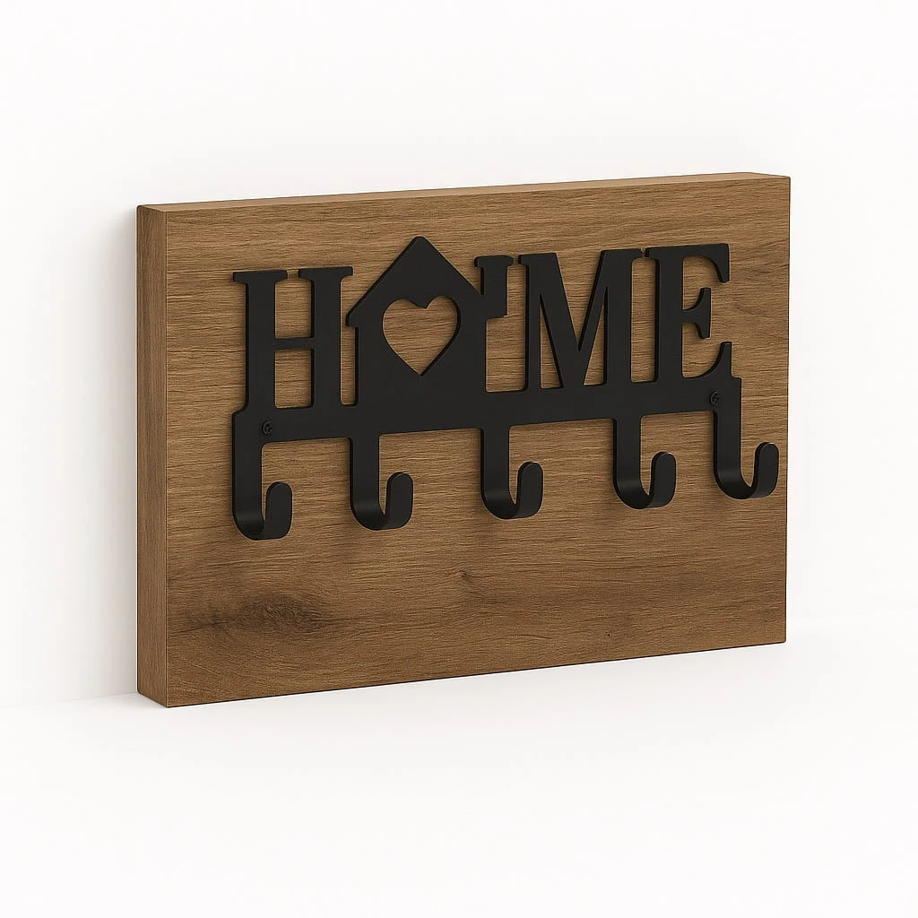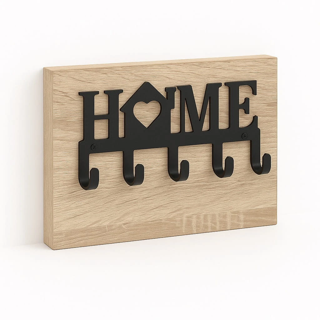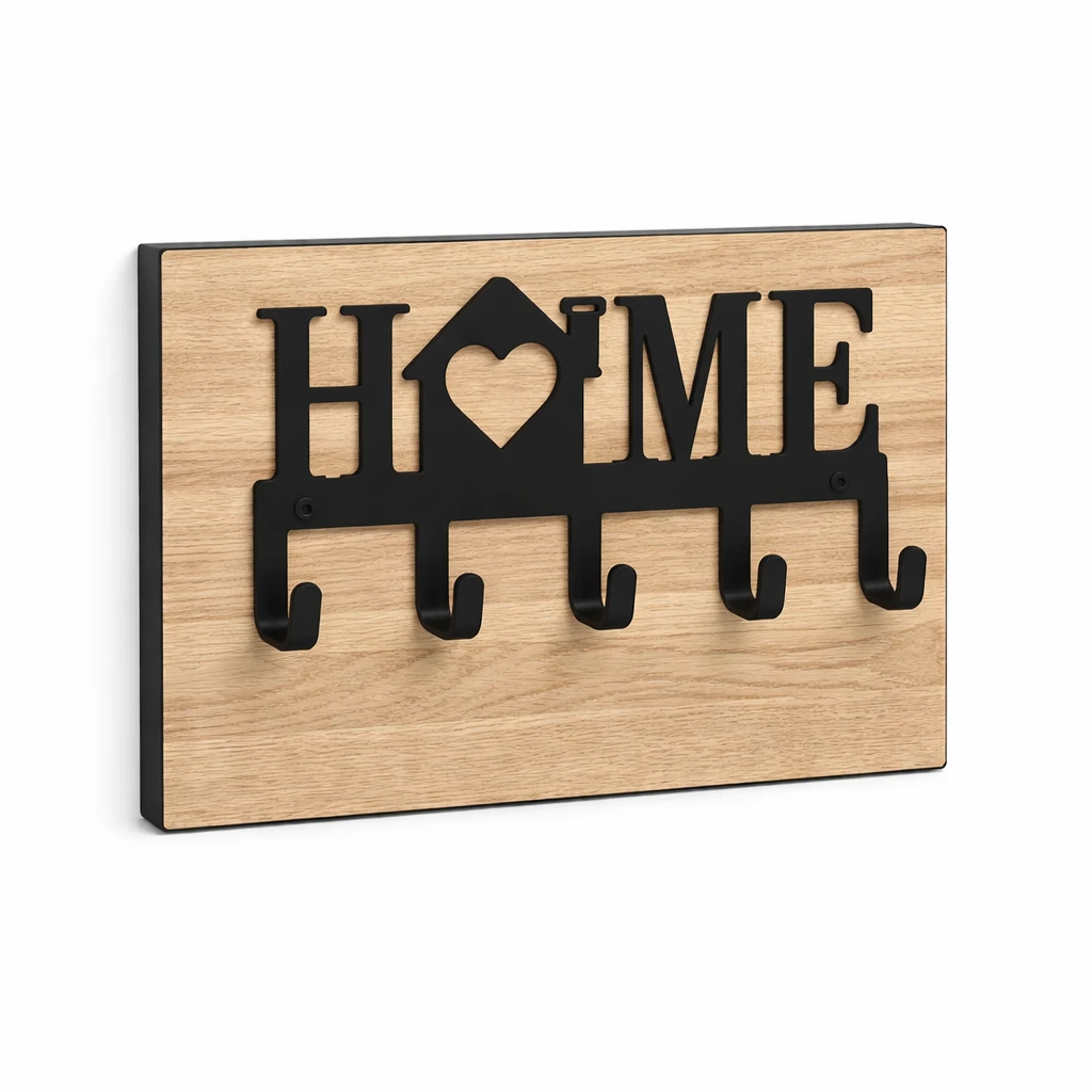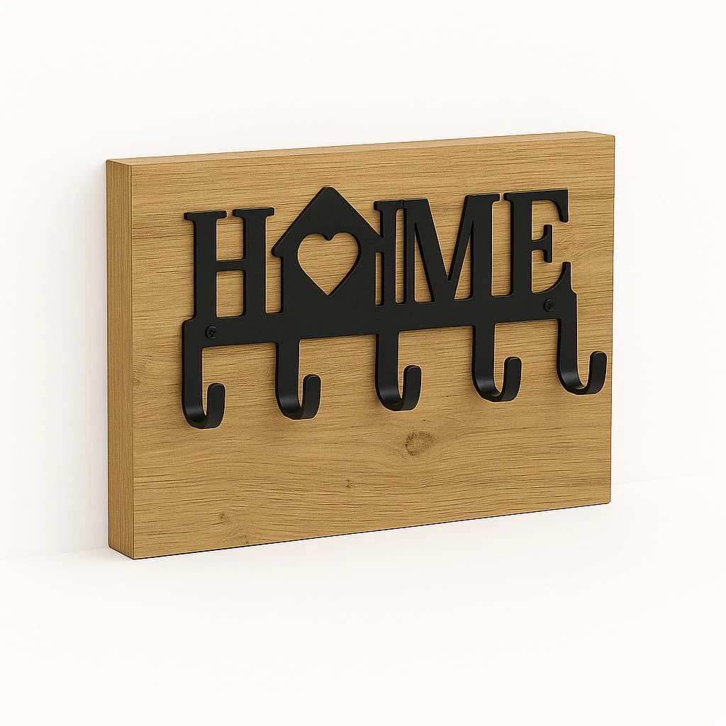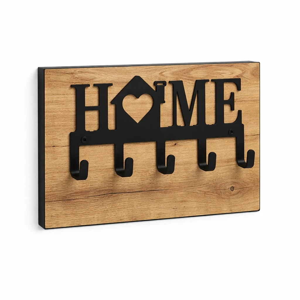 Wieszak na klucze metalowy HOME na płycie to funkcjonalne i estetyczne rozwiązanie, które pozwala uporządkować przestrzeń w przedpokoju oraz zabezpieczyć ścianę przed zabrudzeniami. Dzięki zastosowaniu płyty meblowej produkt łączy praktyczność z eleganckim wyglądem.