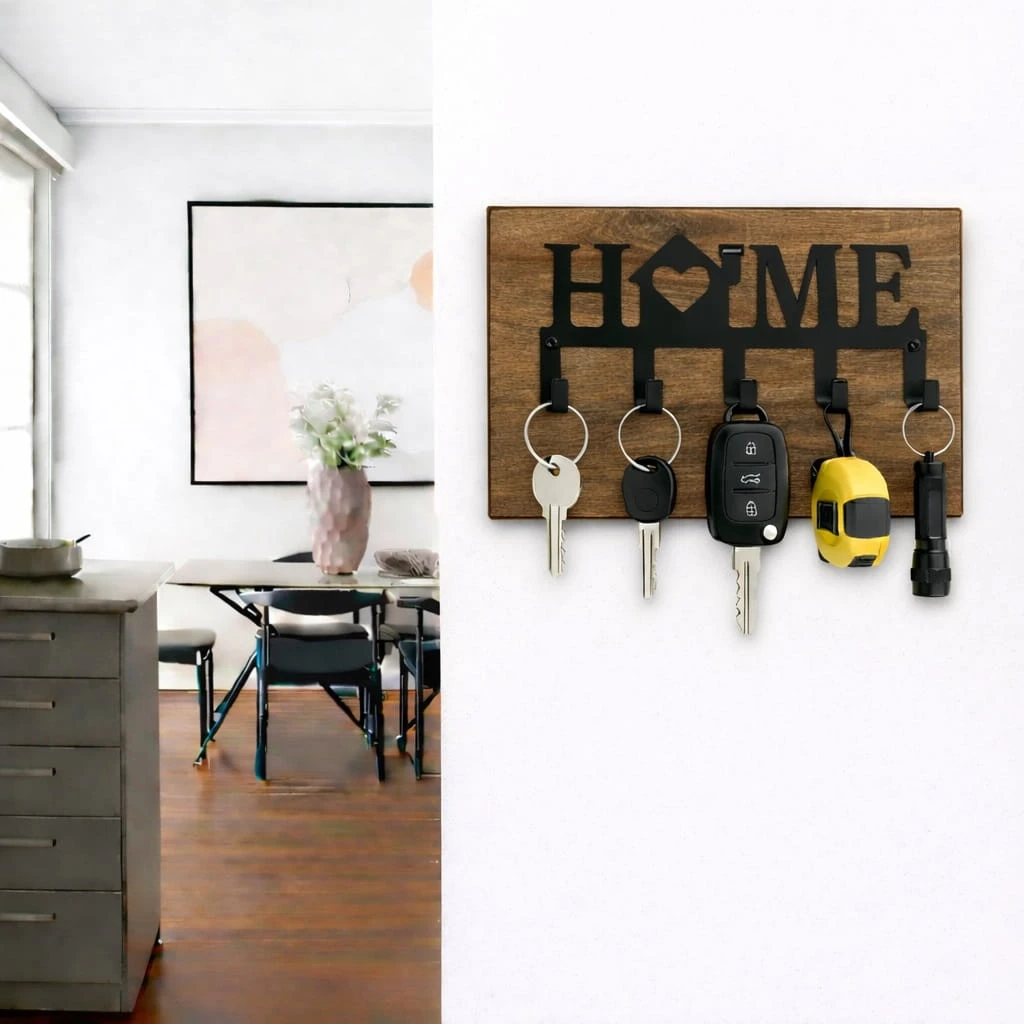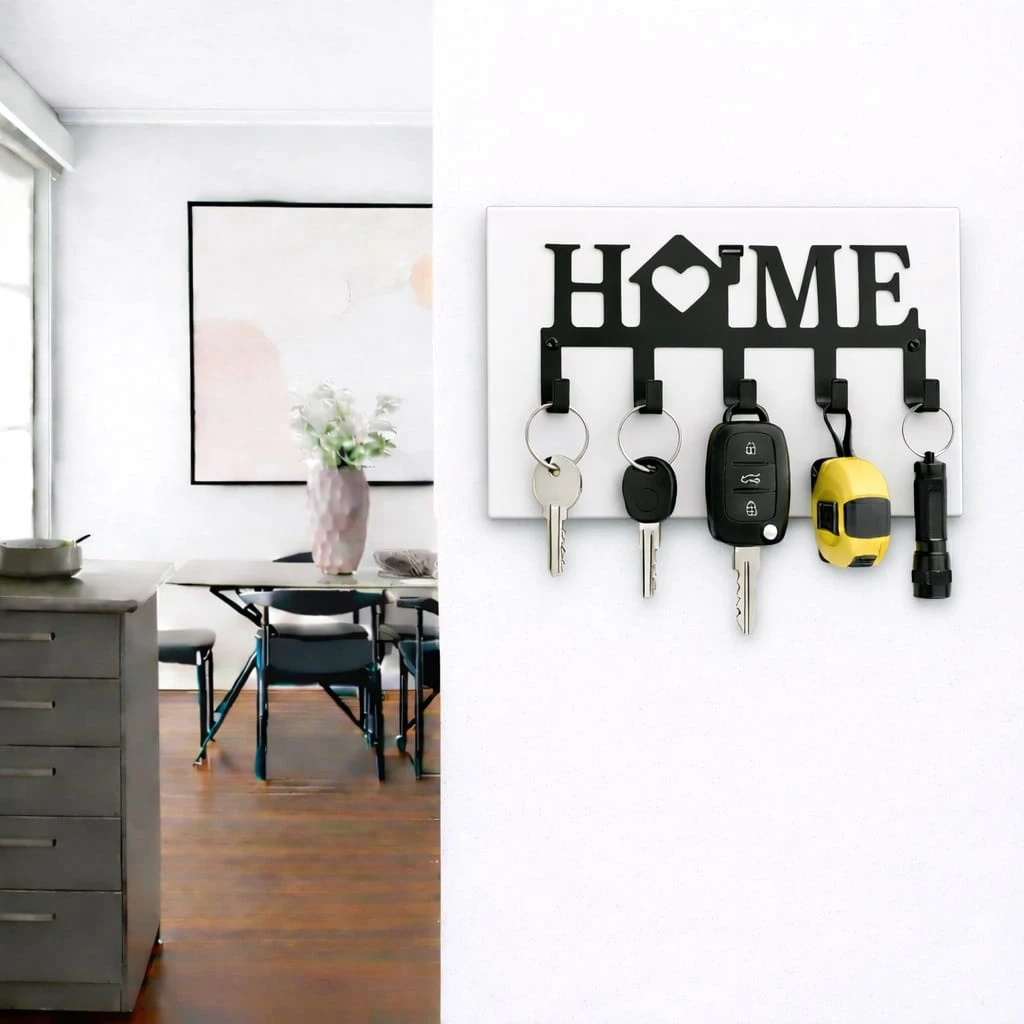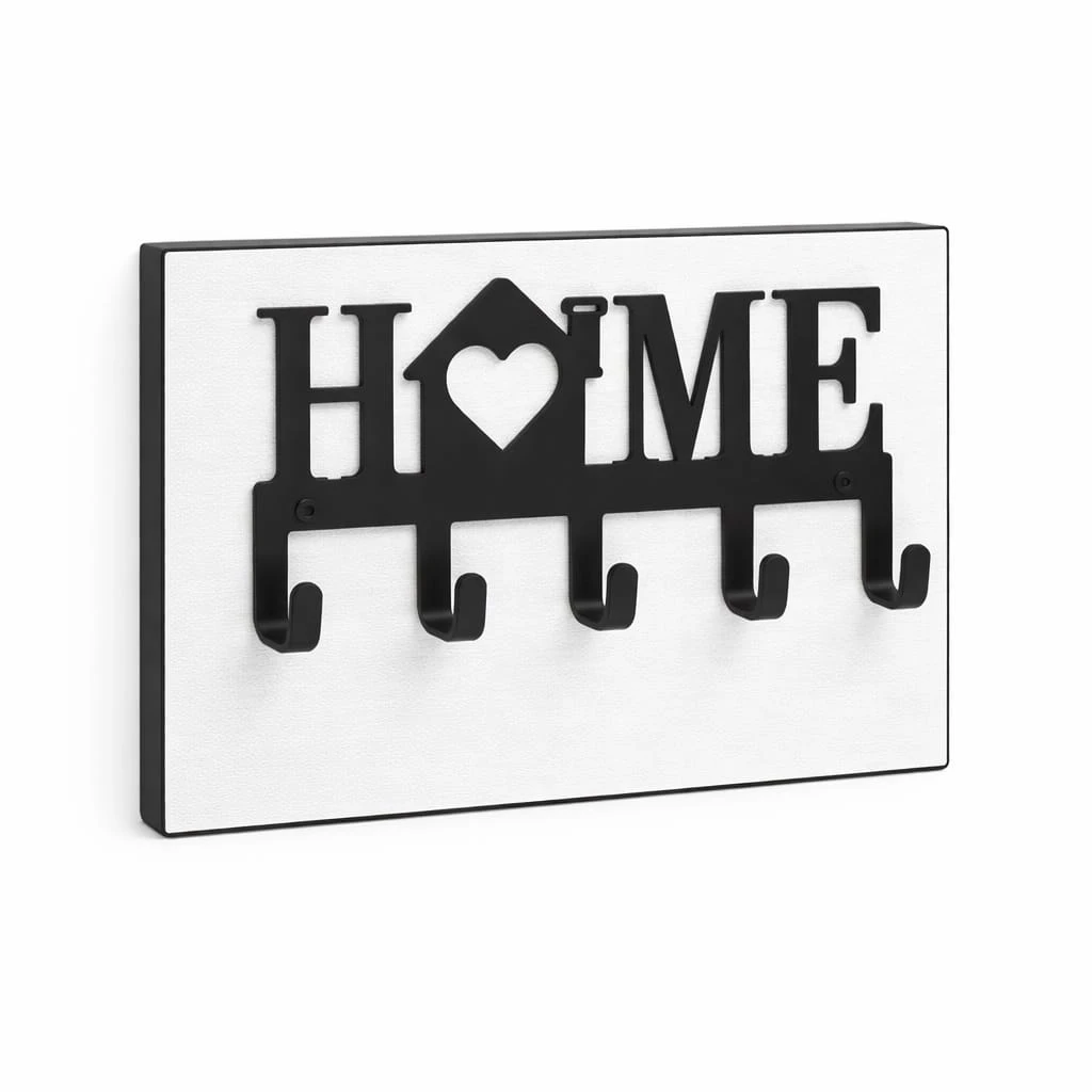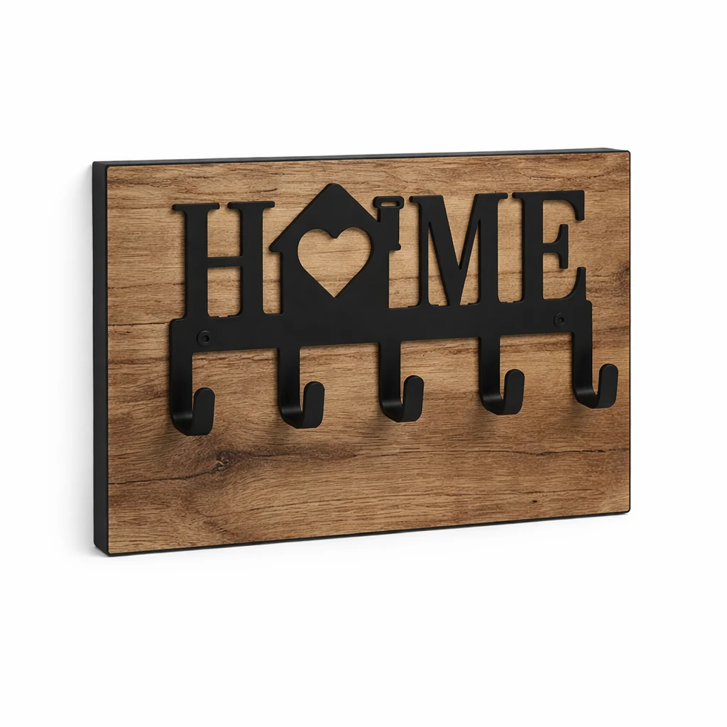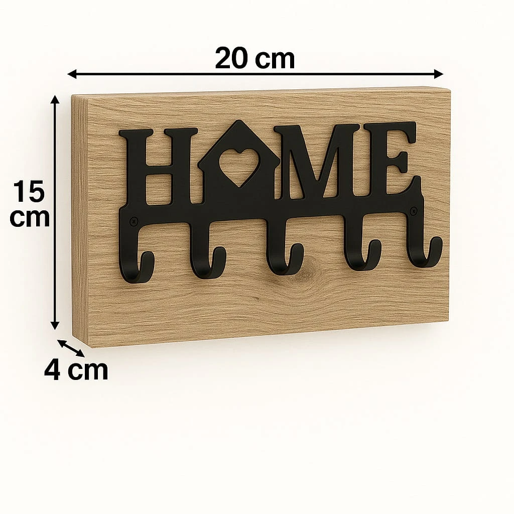 Wieszak na klucze metalowy HOME na płycie to funkcjonalne i estetyczne rozwiązanie, które pozwala uporządkować przestrzeń w przedpokoju oraz zabezpieczyć ścianę przed zabrudzeniami. Dzięki zastosowaniu płyty meblowej produkt łączy praktyczność z eleganckim wyglądem.