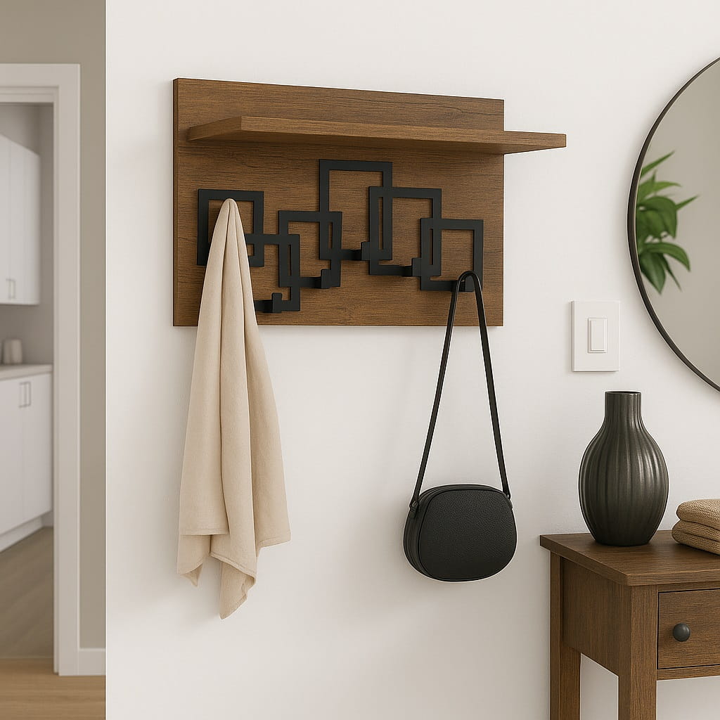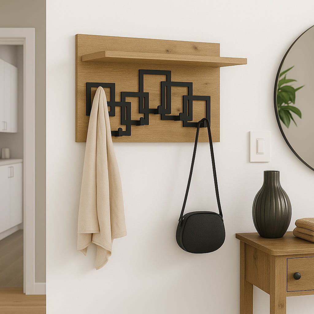 Dzięki temu wieszak z półką do przedpokoju łączy funkcję przechowywania i organizacji, tworząc uporządkowaną oraz wygodną przestrzeń wejściową.